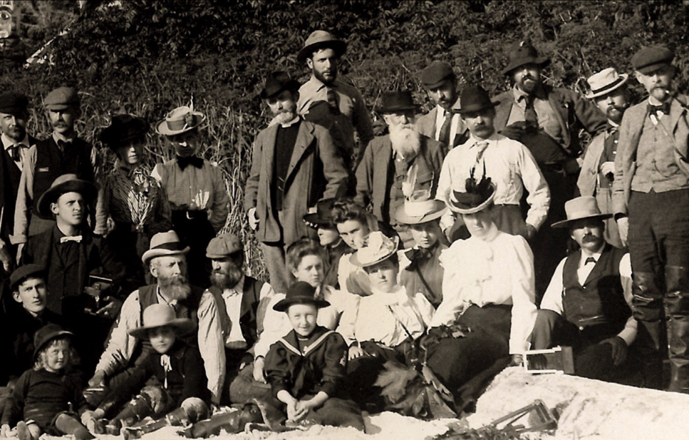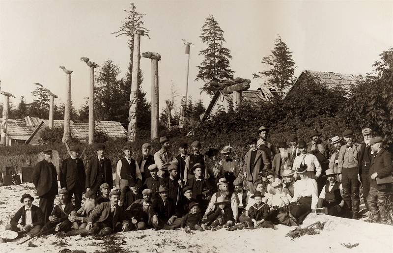 Members of the Harriman party sitting for a portrait in Cape Fox Village, Alaska. Pictured at bottom center, wearing the black hat, is 10 year-old Carol Harriman, Nancy Hannum’s mother.